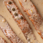 Start by prepping the salmon. Season on all sides, then dredge in flour. This will make it soo nice and crispy on the outside. And add some extra creaminess to the sauce!